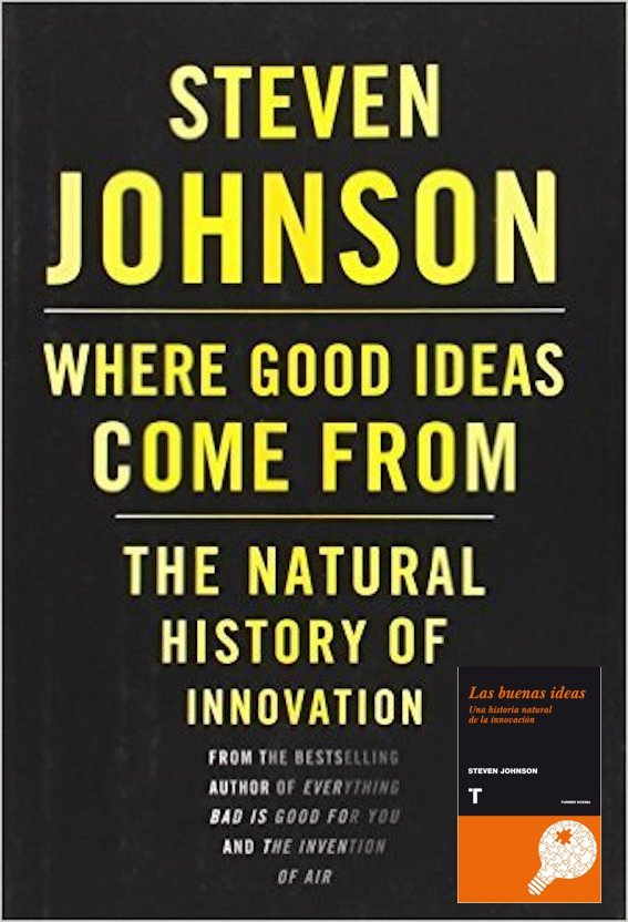 Las buenas ideas (Where Good Ideas come From), de Steven Johnson, autor de varios best-sellers sobre el futuro, las ciencias, etc. Si eres lo suficientemente curioso como para ir descubriendo la historia de la innovación, o quieres innovar, será una delicia leer este libro que está lleno de hechos interesantes. El autor hace un recuento de las grandes invenciones y te presenta 7 patrones detrás de la innovación.
