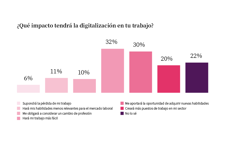 A pesar de los titulares que sugieren la eliminación de puestos de trabajo por la IA generativa y la digitalización, dos tercios de los empleados/as esperan que la digitalización tenga un impacto positivo en sus puestos de trabajo. A medida que disminuya la incertidumbre, la inversión en mejorar las competencias de los trabajadores dará sus frutos: el 50 % considera que su empresa tiene la obligación de prepararlos para las nuevas realidades laborales. Programas de habilidades, basados en previsiones empresariales, son esenciales para que los empleados/as confíen en que sus capacidades y oportunidades. Para las empresas, esto facilitará la redistribución del talento en la organización a medida que cambien las necesidades.