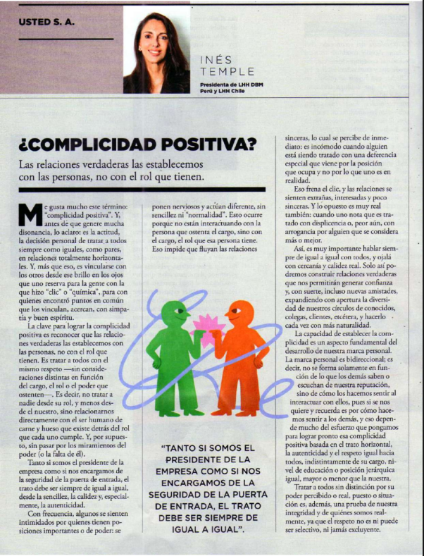 La clave para lograr la complicidad positiva es reconocer que las relaciones verdaderas las establecemos con las personas, no con el rol que tienen. Es tratar a todos con el mismo respeto -sin consideraciones distintas en función del cargo, el rol o el poder que ostenten-. Es decir, no tratar a nadie desde su rol, y menos desde el nuestro, sino relacionarnos directamente con el ser humano de carne y hueso que existe detrás del rol que cada uno cumple. Y, por supuesto, sin pasar por los miramientos del poder (o la falta de él).