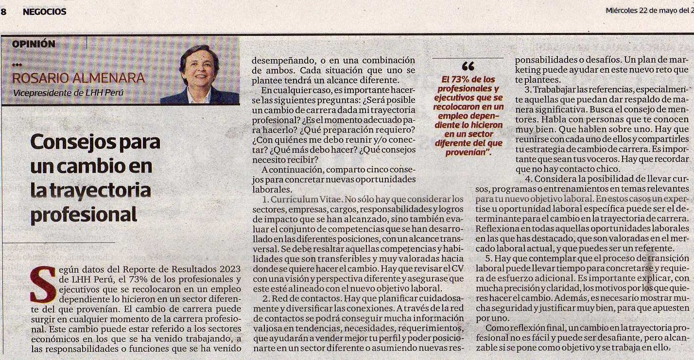 Según datos del Reporte de Resultados 2023 de LHH Perú, el 73% de los profesionales y ejecutivos que se recolocaron en un empleo dependiente lo hicieron en un sector diferente del que provenían. El cambio de carrera puede surgir en cualquier momento de tu carrera profesional. Este cambio puede estar referido a los sectores económicos en los que has venido trabajando, a las responsabilidades o funciones que has venido desempeñando, o en una combinación de ambos. Cada situación que te plantees tendrá un alcance diferente.