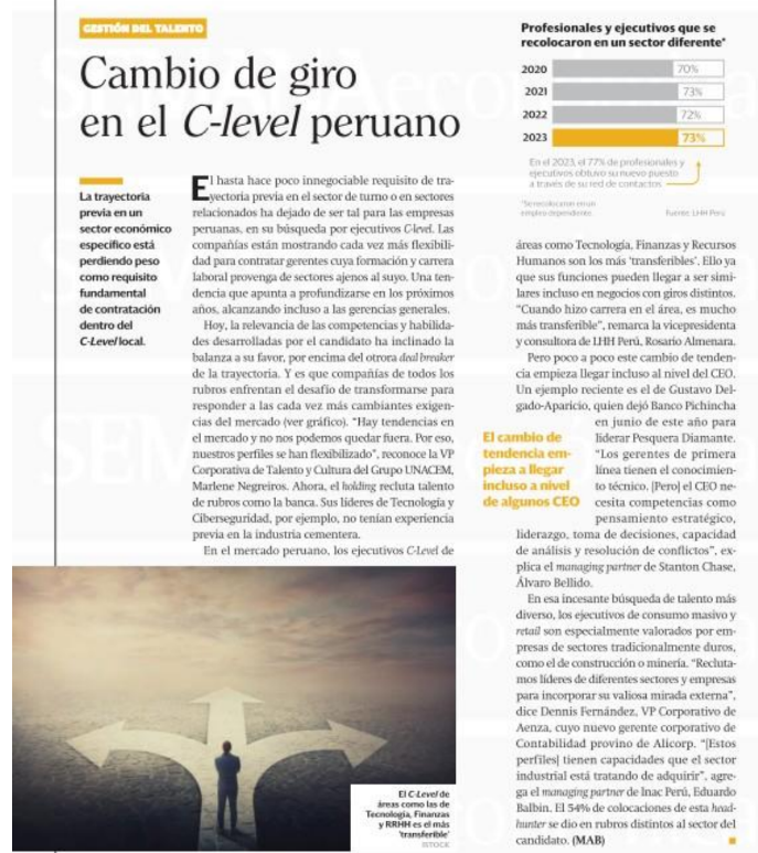 En esa incesante búsqueda de talento C-Level más diverso, los ejecutivos de consumo masivo y retail son especialmente valorados por empresas de sectores tradicionalmente duros, como el de construcción o minería. “Reclutamos líderes de diferentes sectores y empresas para incorporar su valiosa mirada externa”, dice Dennis Fernández, VP Corporativo de Aenza, cuyo nuevo gerente corporativo de Contabilidad provino de Alicorp. “[Estos perfiles] tienen capacidades que el sector industrial está tratando de adquirir”, agrega el managing partner de Inac Perú, Eduardo Balbin. El 54% de colocaciones de esta headhunter se dio en rubros distintos al sector del candidato.