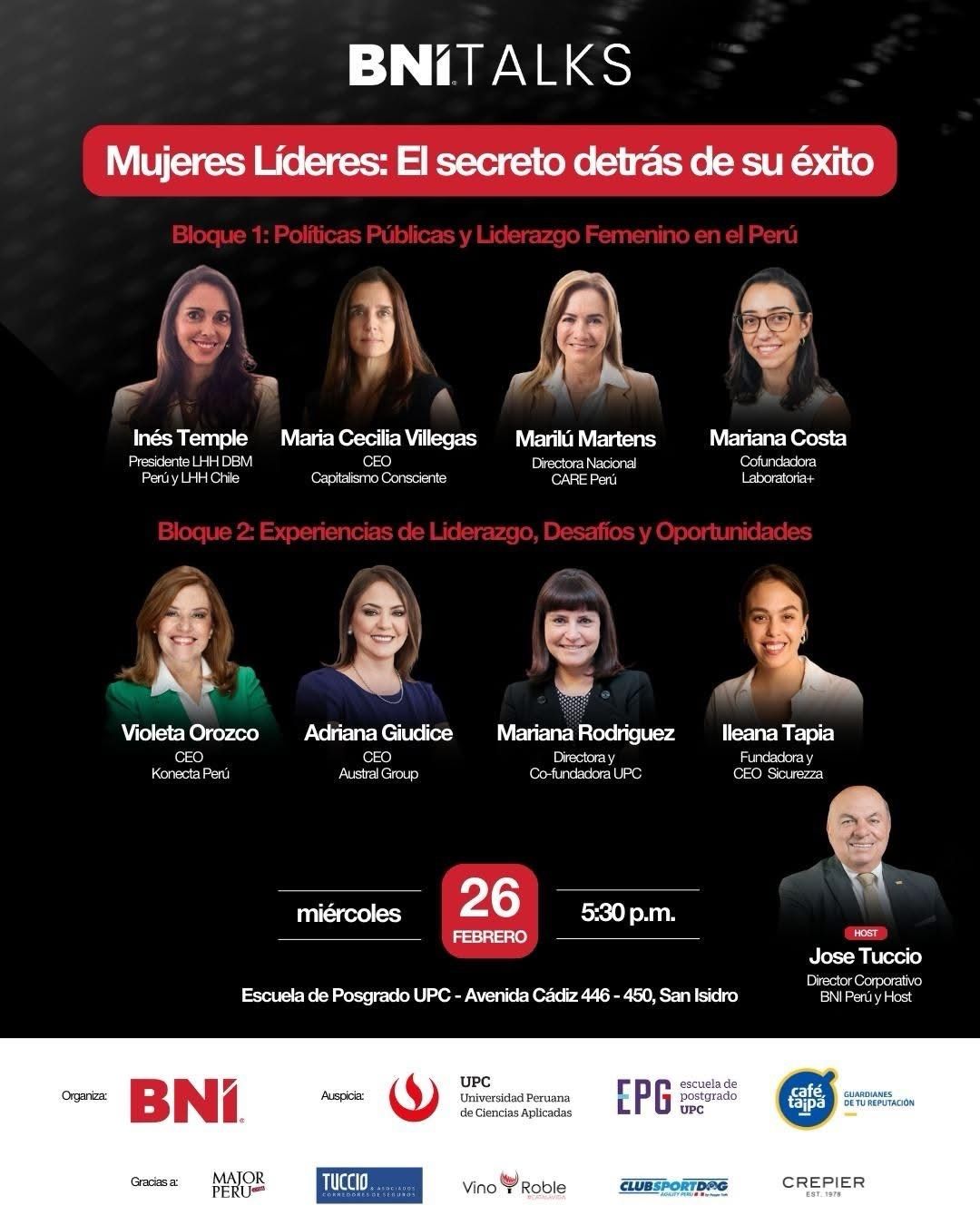 El evento fue conducido por José Tuccio, Director Corporativo de BNI Perú, quien cuenta con más de 10 años de trayectoria liderando espacios de diálogo estratégico. Lo acompañaron en el panel:
