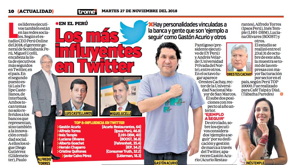 ► El poder de influencia de Gastón Acurio en Twitter, con una respuesta altísima a sus publicaciones, con mucho poder de socialización y sentimiento positivo, frente a temas no solo ligados a la gastronomía, sino al cuidado del ambiente y la fauna, la política y la sociedad peruanas.