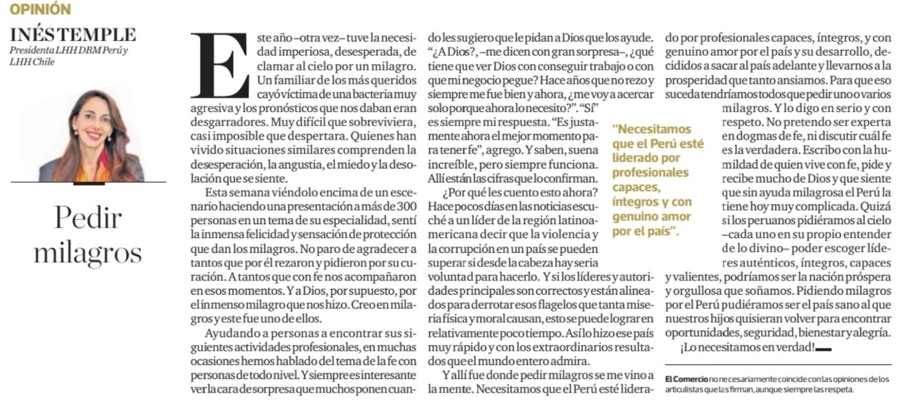 Y allí fue donde pedir milagros se me vino a la mente. Imaginen que el Perú estuviera liderado por profesionales capaces, íntegros, y con genuino amor por el país y su desarrollo, decididos a sacar al país adelante y llevarnos a la prosperidad que tanto ansiamos. Para que eso suceda tendríamos todos que pedir uno o varios milagros. Y lo digo en serio y con respeto. No pretendo ser experta en dogmas de fe, ni discutir cual fe es la verdadera. Escribo con la humildad de quien vive con fe, pide y recibe mucho de Dios y que siente que sin ayuda milagrosa el Perú la tiene hoy muy complicada. Quizá si los peruanos pidiéramos al cielo – cada uno en su propio entender de lo divino – poder escoger líderes auténticos, íntegros, capaces y valientes, podríamos ser la nación prospera y orgullosa que soñamos. Pidiendo milagros por el Perú pudiéramos ser el país al que nuestros hijos quisieran volver para ofrecerles oportunidades, seguridad, bienestar y alegría.