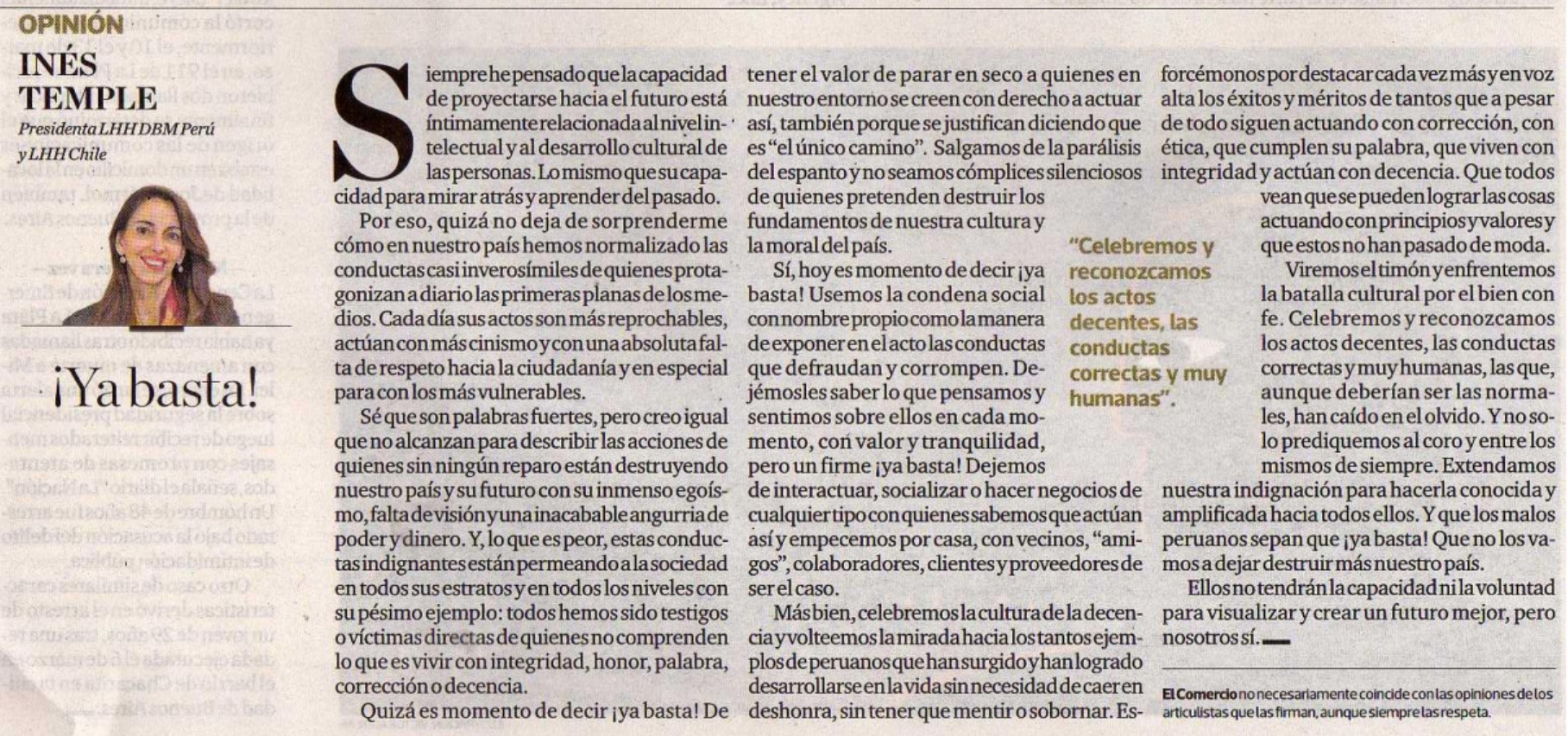 Sí, hoy es momento de decir ¡ya basta! Usemos la condena social con nombre propio como la manera de exponer en el acto las conductas que defraudan y corrompen. Dejémosles saber lo que pensamos y sentimos sobre ellos en cada momento, con valor y tranquilidad, pero un firme ¡ya basta! Dejemos de interactuar, socializar o hacer negocios de cualquier tipo con quienes sabemos actúan así y empecemos por casa, con vecinos, “amigos”, colaboradores, clientes y proveedores de ser el caso.